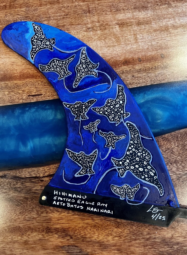 Being back home, my creative spirit has been rekindled, and I am finally following in the footsteps of my mother and favorite aunt – two amazing and accomplished artists. I am finding my way in the visual arts, painting, printing, and computer design. One of my pieces, migrating spotted eagle rays painted on a recycled surfboard fin, was accepted into the “Below the Surface: Marine Life of Hawaii” art exhibit at the Hui No’eau Art Center this spring. The fin was the first piece in the show to sell, too!